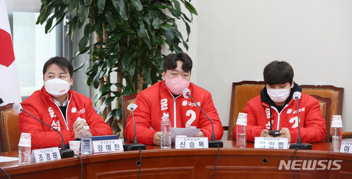 [서울=뉴시스] 김선웅 기자 = 신승욱 국민의힘 청년보좌역이 28일 오전 서울 여의도 국회에서 열린 선거대책본부회의에 참석해 발언하고 있다. (공동취재사진) 2022.02.28. [email protected]