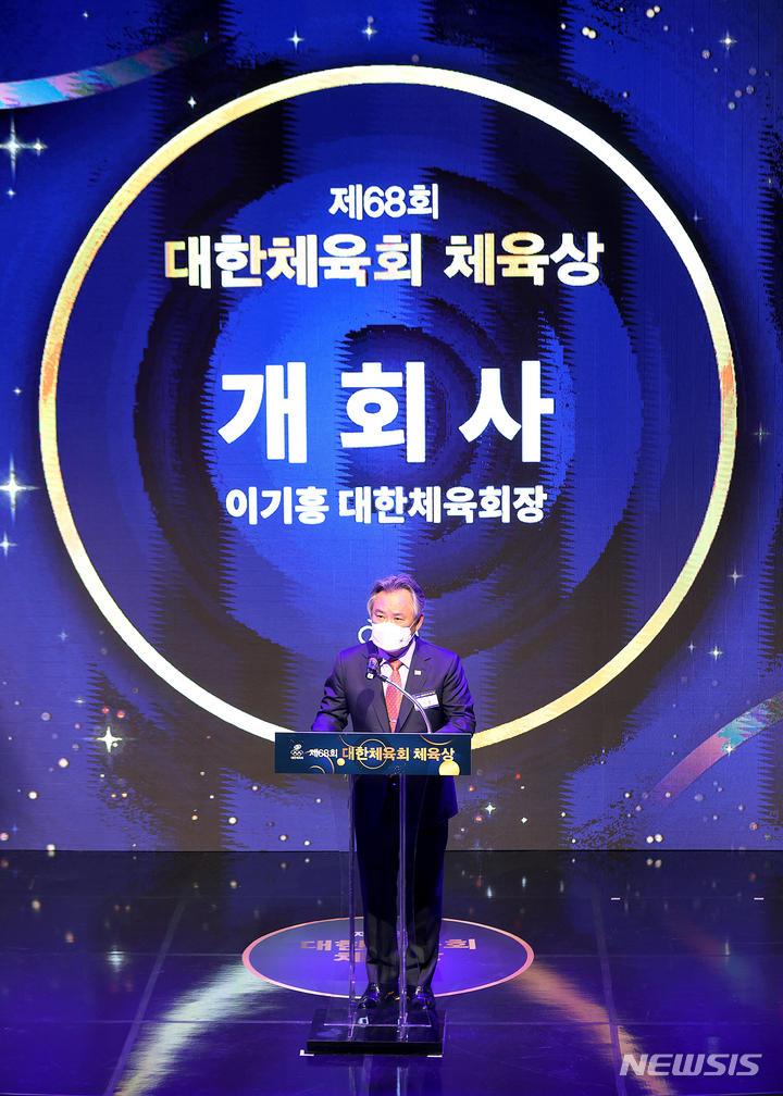 [서울=뉴시스] 김병문 기자 = 이기흥 대한체육회장이 28일 오전 서울 송파구 올림픽공원 뮤즈라이브에서 대한체육회 체육상 시상식에서 개회사를 하고 있다. 2022.02.28. [email protected]
