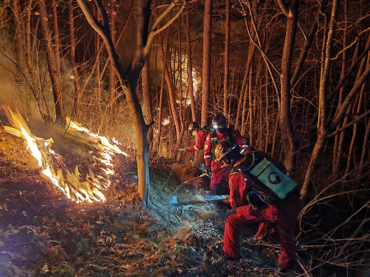 [서울=뉴시스] 산림청 산림항공본부 소속 공중진화대원들이 28일 경남 합천군 율곡면에서 산불을 진화하고 있다. (사진=산림청 제공). 2022.03.01. [email protected]