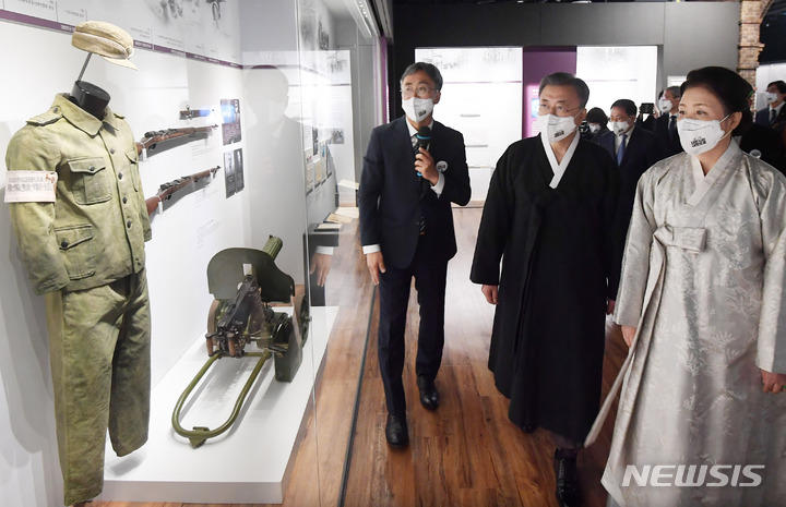 [서울=뉴시스] 김진아 기자 = 문재인 대통령과 김정숙 여사가 1일 서울 서대문구 국립 대한민국임시정부 기념관 상설전시관을 찾아 한국광복군이 사용했던 군복과 소총 전시물을 관람하고 있다. 2022.03.01. [email protected]