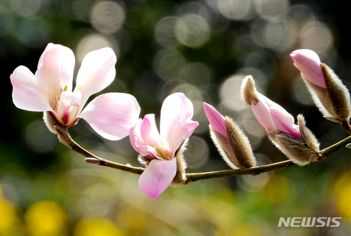 [서귀포=뉴시스] 우장호 기자 = 포근한 날씨를 보인 1일 오후 서귀포시 이중섭 거리 인근에 자주목련이 활짝 펴 봄기운을 느끼게 한다. 기상청에 따르면 이날 서귀포시 낮 최고기온은 17.4도로 올해 들어 가장 높은 기온을 나타냈다. 2022.03.01. [email protected]