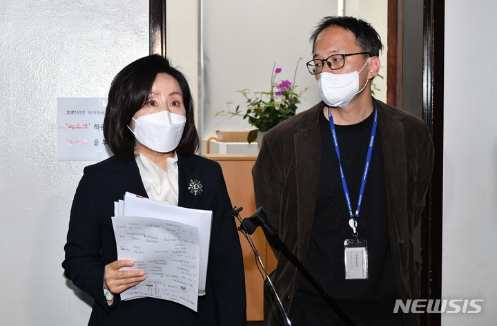 [서울=뉴시스] 최진석 기자 = 박주민(오른쪽) 더불어민주당 의원과 전주혜 국민의힘 의원이 3일 서울 여의도 국회 법제사법위원장실에서 이재명 더불어민주당 대선 후보의 범죄수사경력 자료, 윤석열 국민의힘 대선 후보의 부동시 관련 자료를 열람한 뒤 취재진의 질문에 답하고 있다. (공동취재사진) 2022.03.02. [email protected]