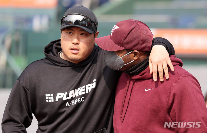 [대전=뉴시스] 김병문 기자 = 4일 대전 한화생명 이글스파크에서 열린 한화 이글스와 키움 히어로즈 연습경기에 앞서 한화의 스프링캠프에 참여한 토론토 블루제이스 류현진이 키움 야시엘 푸이그에게 장난치며 인사를 건네고 있다. 2022.03.04. [email protected]