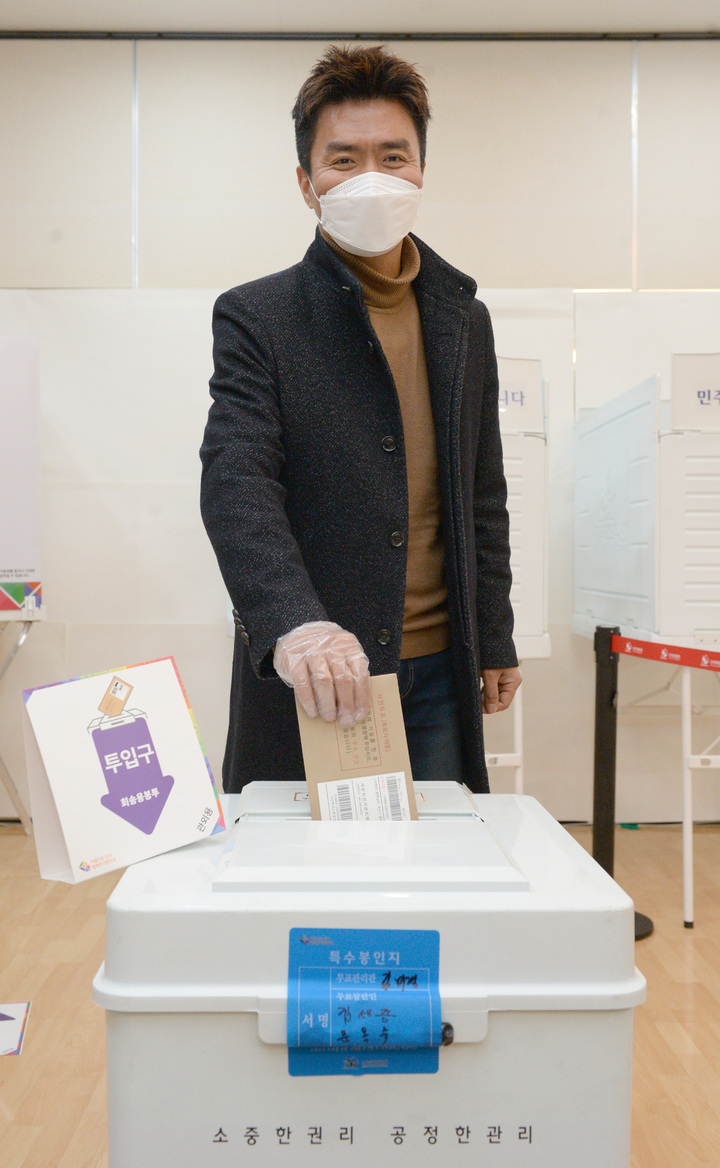 [울산=뉴시스] 배병수 기자 = 노동당 이백윤 대선후보가 제20대 대통령 선거 사전투표 첫날인 4일 오후 울산 남구 신정2동 행정복지센터 사전투표소를 찾아 투표를 하고 있다. 2022.03.04. [email protected]