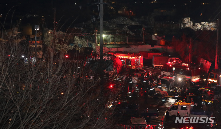 [서울=뉴시스] 이영환 기자 = 4일 오후 서울 강남구 개포동 구룡마을 한 점포에서 발생한 불이 인근으로 번져 소방 당국이 진화 작업을 펼치고 있다. 강남소방서는 오후 6시17분께 인근 소방서 인력까지 출동하는 화재대응 2단계를 발령해 현장에서 불을 진화 중이다. 당초 5시20분께 화재대응 1단계를 발령했으나 상황을 고려해 대응 단계를 높인 것이다. 2022.03.04. [email protected]