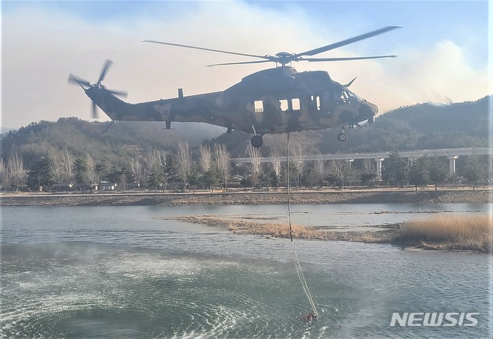 [삼척=뉴시스] 이덕화 기자 = 지난 4일 낮 경북 울진에서 시작된 불이 강원 삼척까지 번진 가운데 월천리 수변공원 옆 가곡천 상공에서 소방헬기가 진화를 위해 담수하고 있다. 2022.03.05. [email protected]