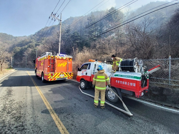 [서울=뉴시스] 6일 오전 강릉 옥계 남양리에서 의용소방대원들이 산불을 진화하고 있다. (사진=소방청 제공). 2022.03.06. [email protected] *재판매 및 DB 금지