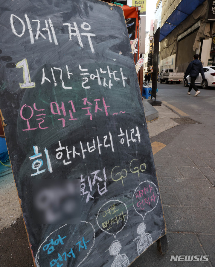 [서울=뉴시스] 고범준 기자 = 식당·카페 등 12종 다중이용시설 영업 시간이 밤 10시에서 11시까지 1시간 연장되고 사적모임 인원 제한 6명은 종전대로 유지되는 가운데 6일 서울 종로구의 한 식당 앞에 '이제 겨우 1시간 늘어났다'라는 영업 시간 관련 글귀가 적혀 있다. 2022.03.06. [email protected]