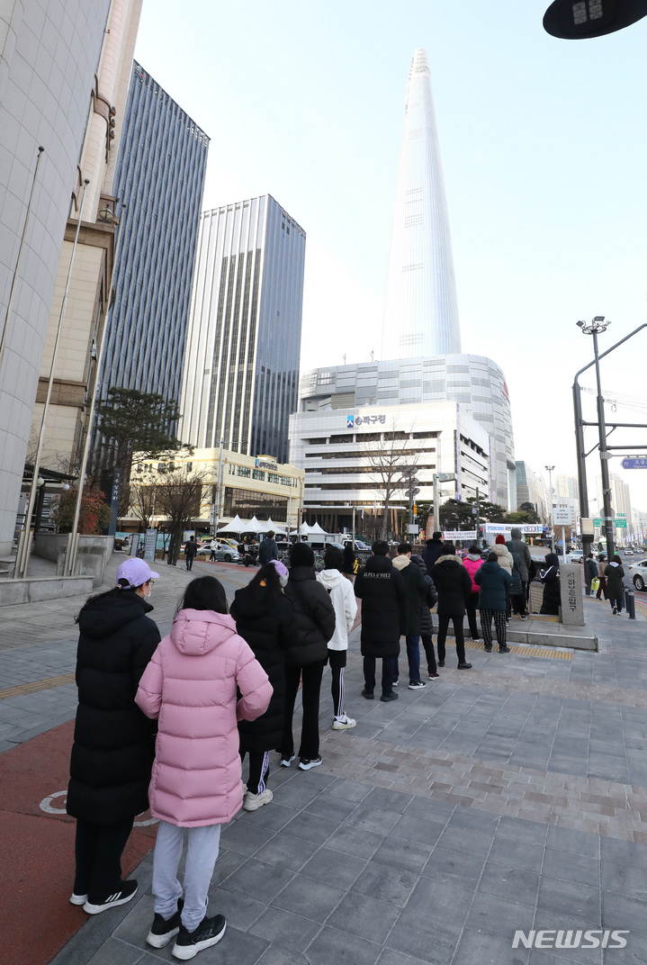 [서울=뉴시스] 이영환 기자 = 0시 기준 코로나19 신규 확진자가 21만716명 발생한 7일 오전 서울 송파구보건소 선별진료소를 찾은 시민들이 검사를 받기 위해 건너편 지하보도 출입구에서 대기하고 있다. 2022.03.07. [email protected]