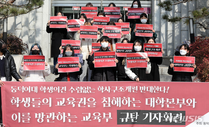 [서울=뉴시스] 고범준 기자 = 동덕여자대학교 제55대 총학생회 '루트'회원들이 7일 오전 서울 성북구 동덕여자대학교 본관 앞에서 학생들의 교육권을 침해하는 대학본부와 이를 방관하는 교육부를 규탄하는 기자회견을 하고 있다. 2022.03.07. [email protected]