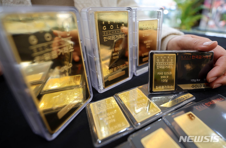 [서울=뉴시스] 고범준 기자 = 러시아의 우크라이나 침공으로 금값이 강세를 보이고 있는 7일 오후 서울 종로구 한국금거래소 종로본점에서 관계자가 골드바를 살펴보고 있다. 2022.03.07. [email protected]