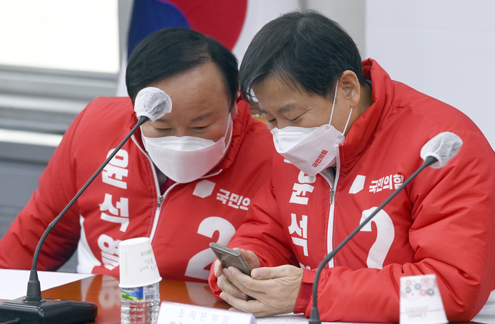 [서울=뉴시스] 최진석 기자 = 국민의힘 김재원(왼쪽) 클린선거전략본부장과 이철규 조직본부장이 8일 오전 국회에서 열린 확대선거대책본부 회의에서 스마트폰을 보고 있다. (공동취재사진) 2022.03.08. [email protected]
