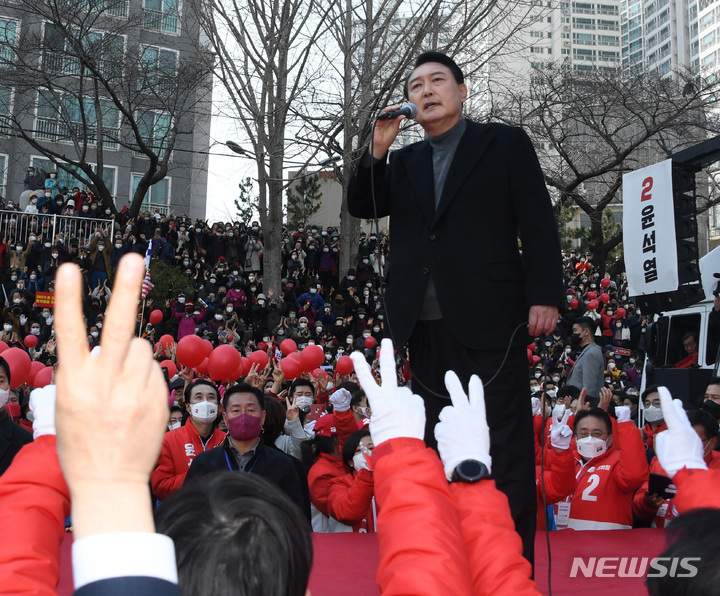 [부산=뉴시스] 전신 기자 = 윤석열 국민의힘 대선 후보가 8일 부산시 연제구 세병로에서 열린 “국민이 승리 합니다” 유세에서 지지를 호소하고 있다. 2022.03.08. [email protected]