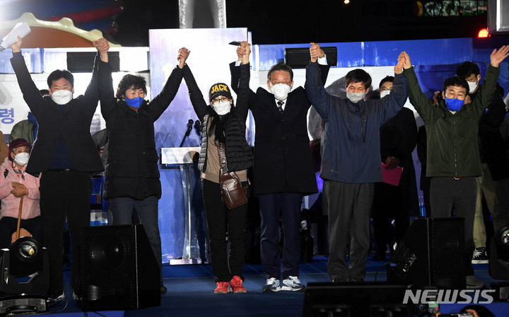 [서울=뉴시스] 국회사진기자단 = 이재명 더불어민주당 대선 후보가 8일 오후 서울 중구 청계광장에서 유세를 하며 초등학교 동창들과 함께 지지를 호소하고 있다. 2022.03.08. [email protected]