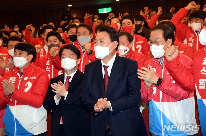 [서울=뉴시스] 전신 기자 = 윤석열 제20대 대통령선거 당선인이 10일 새벽 서울 여의도 국회도서관에 마련된 '국민의힘 제 20대 대통령선거 개표상황실'에서 개표 방송을 보며 박수치고 있다. (공동취재사진) 2022.03.10. [email protected]