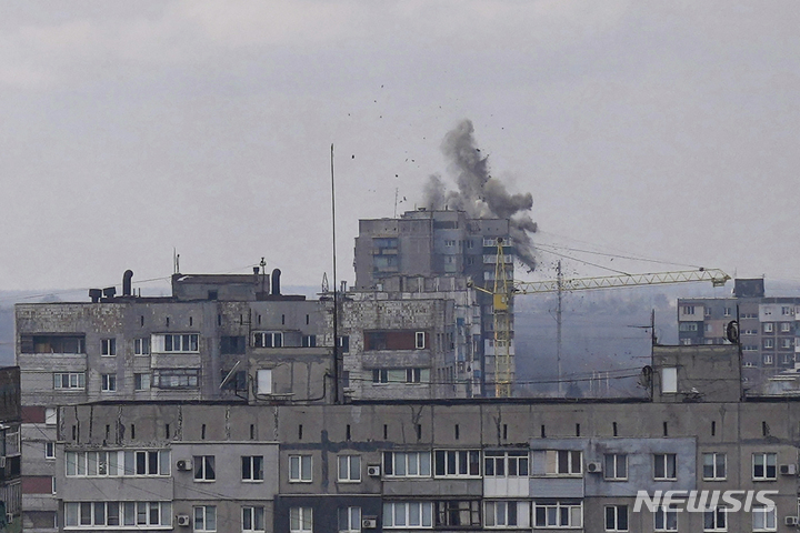[마리우폴=AP/뉴시스] 10일(현지시간) 우크라이나 마리우폴 주택가에서 러시아군의 포격으로 폭발이 일어나고 있다. 미 국방부 관계자는 "러시아군이 전세를 뒤집기 위해 장거리 포격을 늘리고 있다"라고 전했다. 2022.03.11.