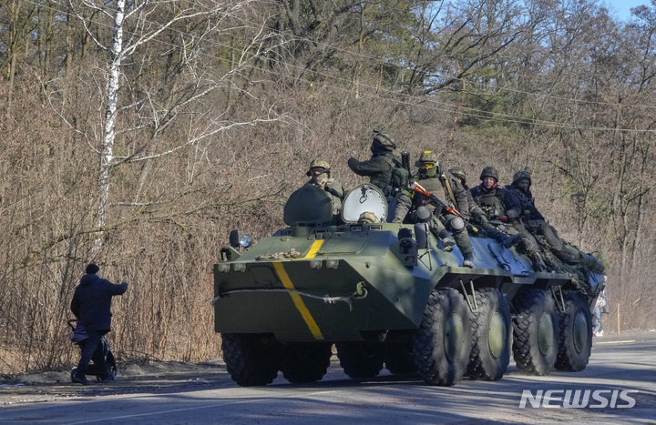 [비시호로드=AP/뉴시스] 10일(현지시간) 우크라이나 키이우 인근 비시호로드에서 유모차를 밀고 피난 중이던 한 남성이 장갑차를 타고 이동하는 우크라이나군 병사들에게 손을 흔들고 있다. 2022.03.11.