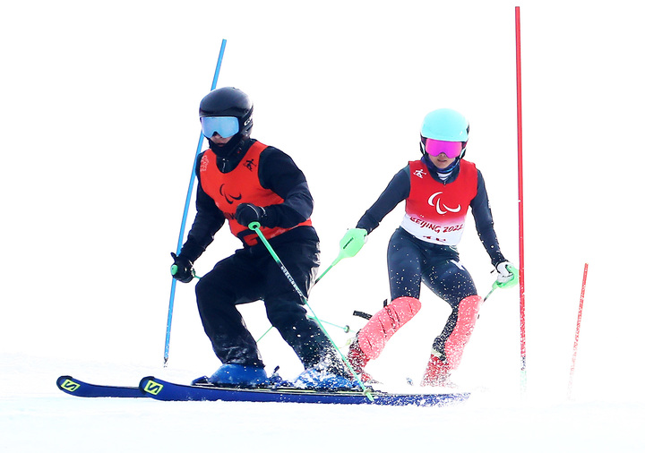 [서울=뉴시스] 이영환 기자 = 한국 선수단의 최연소 국가대표 최사라(오른쪽)가 12일 중국 옌칭 국립알파인스키센터에서 열린 2022 베이징 동계패럴림픽 알파인스키 여자 회전 시각장애 부문에서 가이드 러너 김유성과 레이스를 펼치고 있다. (사진=대한장애인체육회 제공) 2022.03.12. [email protected]