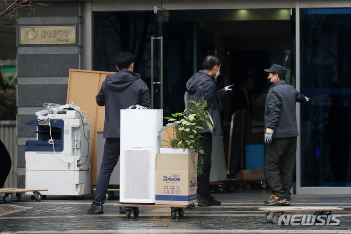 [서울=뉴시스] 조성우 기자 = 13일 윤석열 대통령 당선인이 내일(14일) 출근 예정인 서울 종로구 통의동 금융감독원 연수원에 마련된 집무실에서 작업자들이 분주히 움직이고 있다. 2022.03.13. [email protected]