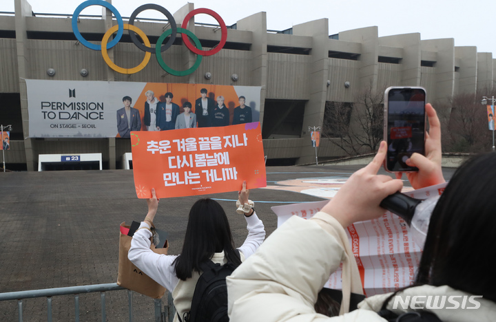 [서울=뉴시스] 고승민 기자 = 방탄소년단(BTS) 팬들이 13일 서울 잠실종합운동장에서 열린 'BTS 퍼미션 투 댄스 온 스테이지 - 서울' 콘서트를 찾아 기념촬영을 하고 있다. 2022.03.13. [email protected]