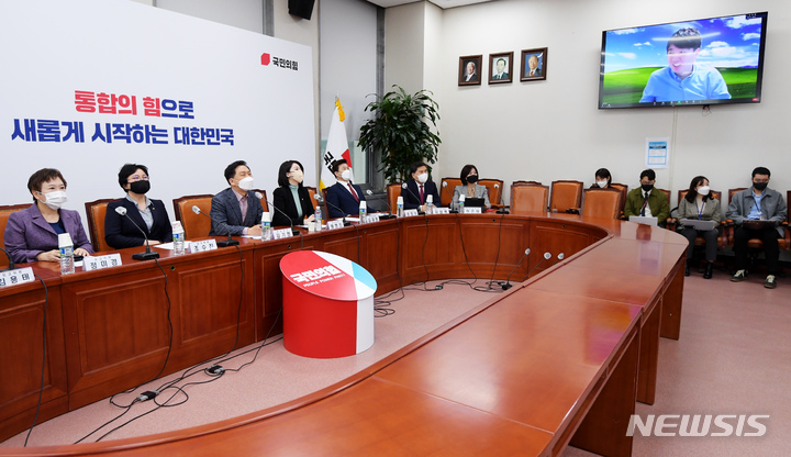 [서울=뉴시스] 최진석 기자 = 이준석 국민의힘 대표가 14일 오전 서울 여의도 국회에서 열린 최고위원회의에서 발언하고 있다. 이 대표는 코로나19 확진으로 이날 회의에는 화상으로 참여했다. (공동취재사진) 2022.03.14. [email protected]