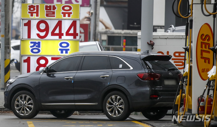[용인=뉴시스] 정병혁 기자 = 러시아-우크라이나 전쟁 여파로 국제유가가 급등하면서 기름값이 상승세를 이어가고 있는 14일 오후 경기 용인시 알뜰주유소에 유가 정보가 나와있다. 2022.03.14. [email protected]
