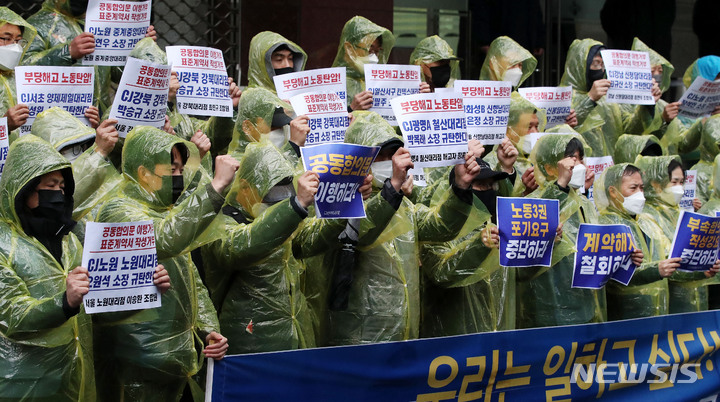 [서울=뉴시스] 홍효식 기자 = 전국택배노동조합원들이 14일 오후 서울 중구 CJ대한통운 본사 앞에서 열린 공동합의 불이행 및 집단해고 규탄 회견 및 결의대회에서 피켓을 들고 구호를 외치고 있다. 2022.03.14. yesphoto@newsis