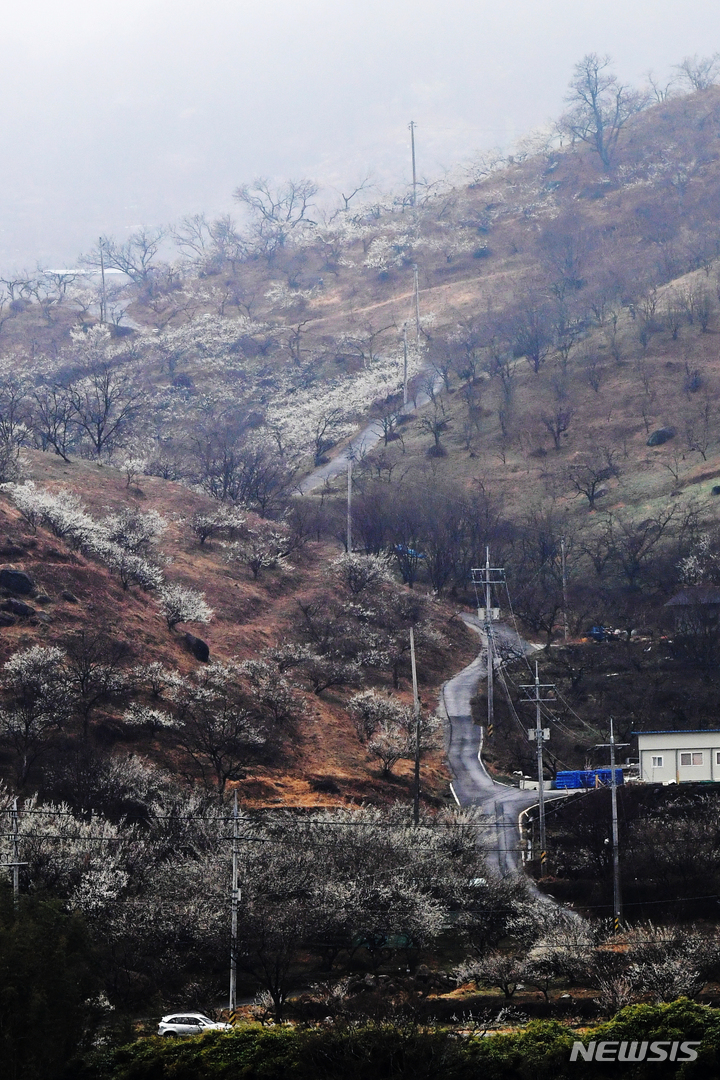 [하동=뉴시스] 차용현 기자 = 봄비가 내리고 있는 14일 오후 경남 하동군 하동읍 섬진강변에서 바라 본 전남 광양시 매화마을에 매화꽃이 활짝 피어 있다. 2022.03.14. [email protected]