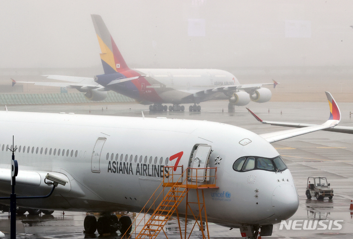 [인천공항=뉴시스] 김병문 기자 = 아시아나항공이 다음 달 1일부터 11개월 만에 일본 나고야 운항을 다시 시작한다고 밝힌 14일 오후 인천국제공항 1터미널에 아시아나항공 여객기가 보이고 있다. 2022.03.14. [email protected]