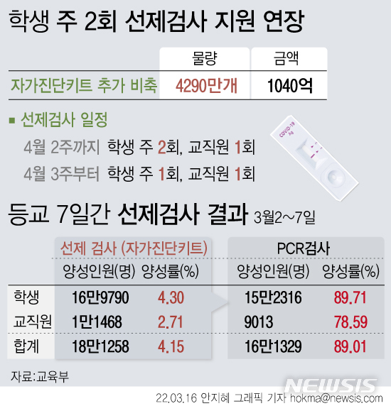 [서울=뉴시스] 교육부는 유행 정점이 향후 1~2주간 지속되다 감소할 것이라는 예측에 따라 다음달 16일까지 현행 학생 주 2회, 교직원 주 1회 선제검사를 유지키로 했다. 다음달 18일 이후에는 교육감이 직접 지역별 감염병 상황을 판단해 선제검사 횟수나 주기 등을 탄력적으로 정해 운영할 수 있도록 허용했다.