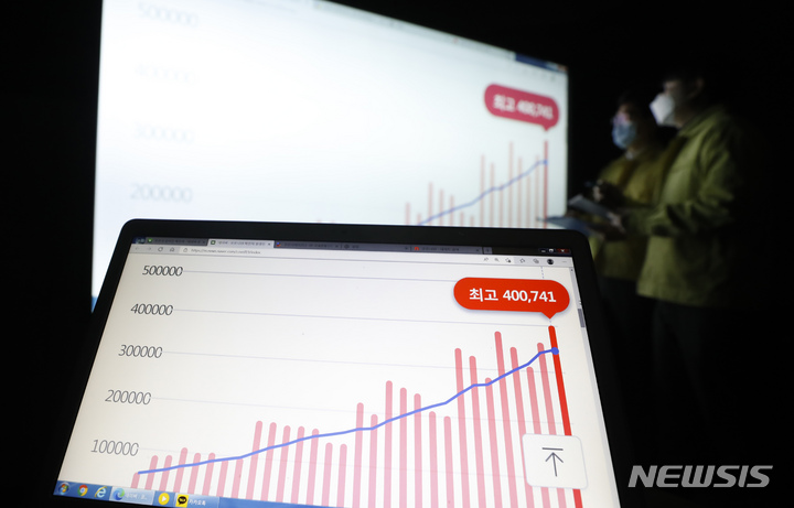 [서울=뉴시스] 고승민 기자 = 0시 기준 코로나19 신규 확진자가 40만 741명으로 기록된 16일 송파구청 기획상황실에서 관계자들이 확진자수를 살피고 있다. 2022.03.16. [email protected]