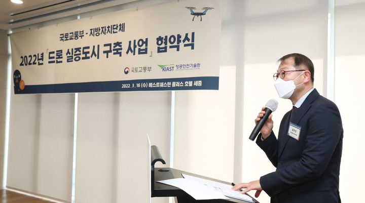 [서울=뉴시스] 홍찬선 기자 = 김헌정 국토교통부 항공정책관이 16일 오전 세종 베스트웨스턴 호텔에서 열린 국토부와 인천·세종 등 9개 지방자치단체가 주최한 '22년도 드론 실증도시구축사업' 협약식에 참석해 인사말을 하고 있다. (사진=국토교통부 제공) 2022.03.16. [email protected]