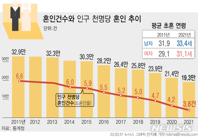평균 초혼 연령은 남자와 여자가 각각 33.4세, 31.1세로 1년 전에 비해 각각 0.1세, 0.3세 상승했다. (그래픽=안지혜 기자)