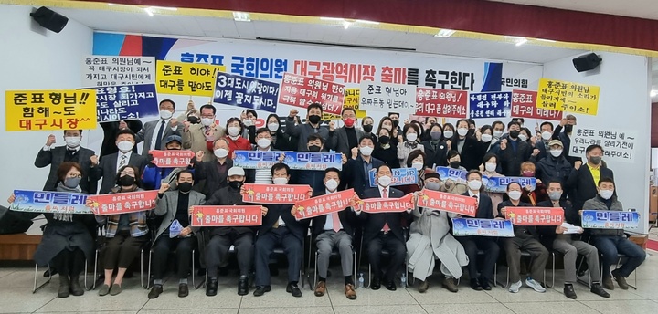 [대구=뉴시스] 박홍식 기자 = 홍준표 의원 지지 모임인 '민들레포럼(이사장 김상훈)' 회원 100명이 17일 오후 국민의힘 대구시당 강당에서 '홍준표 대구시장 출마 촉구' 결의대회를 열고 있다.
