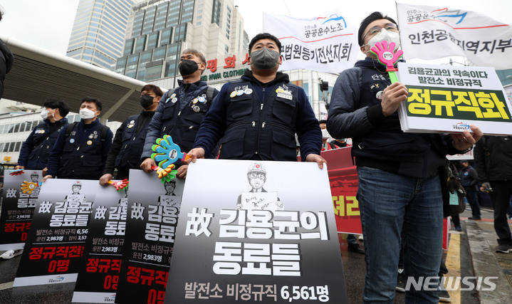 [서울=뉴시스] 홍효식 기자 = 19일 오후 서울 중구 전태일 다리에서 민주노총 공공운수노조 조합원들이 비정규직 차별 철폐 촉구 집회를 하고 있다. 2022.03.19. [email protected]