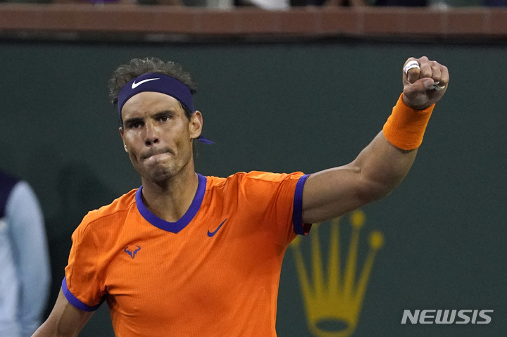 [인디언웰스=AP/뉴시스] 라파엘 나달(4위·스페인)이 19일(현지시간) 미 캘리포니아주 인디언웰스에서 열린 BNP파리바 오픈 남자 단식 준결승전 카를로스 알카라스(19위·스페인)를 물리치고 기뻐하고 있다. 나달은 알카라스를 세트스코어 2-1(6-4 4-6 6-3)로 꺾고 20연승을 달리며 결승에 올랐다. 2022.03.20.