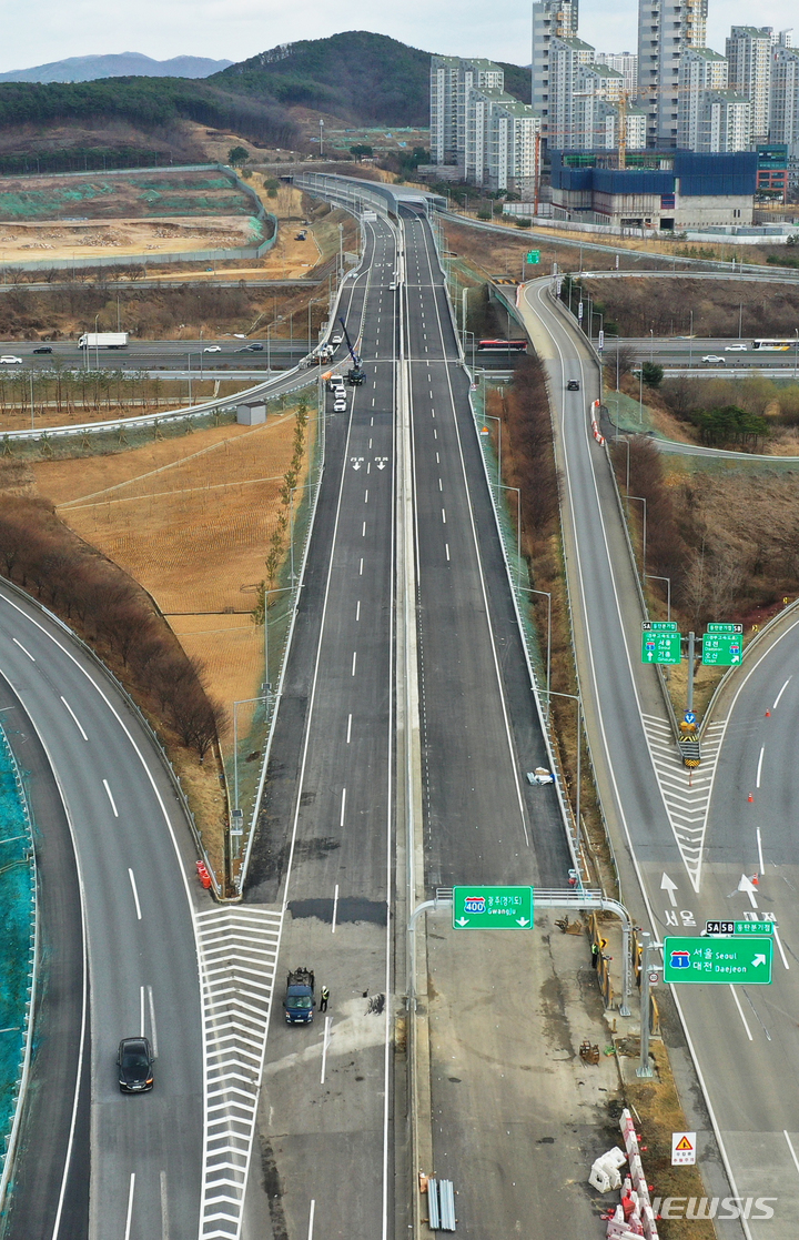 [화성=뉴시스] 김종택기자 = 경기도 화성시와 광주시를 연결하는 연장 31.2km의 왕복 4차선 화성~광주 고속도로가 21일 0시 개통을 앞두고 마무리 작업이 한창이다. 화성~광주 고속도로는 수도권 제2외곽순환 고속도로의 남동부구간으로 이용객의 편리성을 향상시키고자 총4개의 나들목을 설치하여 경부·중부·영동고속도로와 연결돼 있다. 사진은 20일 오후 화성~광주 고속도로 기점인 동탄 분기점 모습. 2022.03.20. [email protected]