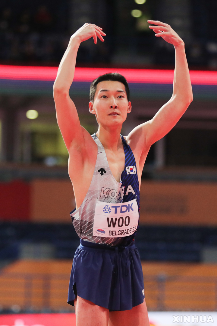 [베오그라드=신화/뉴시스] 우상혁이 20일(현지시간) 세르비아 베오그라드의 스타크 아레나에서 열린 2022 세계실내육상선수권대회 남자 높이뛰기 결선 경기 중 바를 넘고 기뻐하고 있다. 우상혁은 2m34를 넘어 금메달을 목에 걸며 한국 선수 최초로 세계실내육상선수권 메달리스트로 등극했다. 2022.03.21.