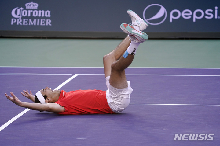 [인디언웰스=AP/뉴시스] 테일러 프리츠(20위·미국)가 20일(현지시간) 미 캘리포니아주 인디언웰스에서 열린 BNP파리바 오픈 남자 단식 결승전에서 라파엘 나달(4위·스페인)을 꺾고 코트에 누워 환호하고 있다. 프리츠는 시즌 20연승을 달리던 나달을 세트스코어 2-0(6-3 7-6<7-5>)으로 물리치고 정상에 올랐다. 2022.03.21.