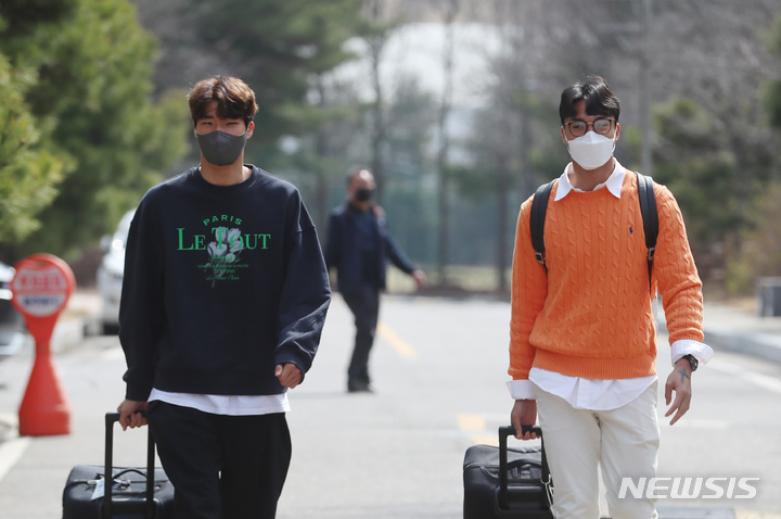 [파주=뉴시스] 고승민 기자 = 카타르 월드컵 아시아 최종예선 대한민국 대 이란전을 사흘 앞둔 21일 축구대표팀 송범근(왼쪽), 김동준이 경기 파주 국가대표트레이닝센터(NFC)로 들어서고 있다. 2022.03.21. [email protected]