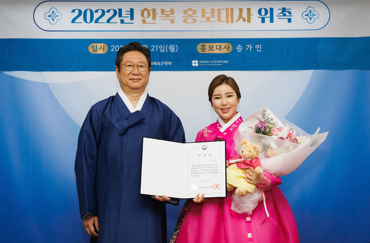 [서울=뉴시스] 백동현 기자 = 황희(왼쪽) 문화체육관광부 장관이 21일 서울 용산구 문체부 저작권보호과 서울사무소에서 열린 2022년 한복 홍보대사 위촉식에서 가수 송가인에게 위촉장을 수여하고 기념촬영하고 있다. (사진=문화체육관광부 제공) 2022.03.21. [email protected] *재판매 및 DB 금지