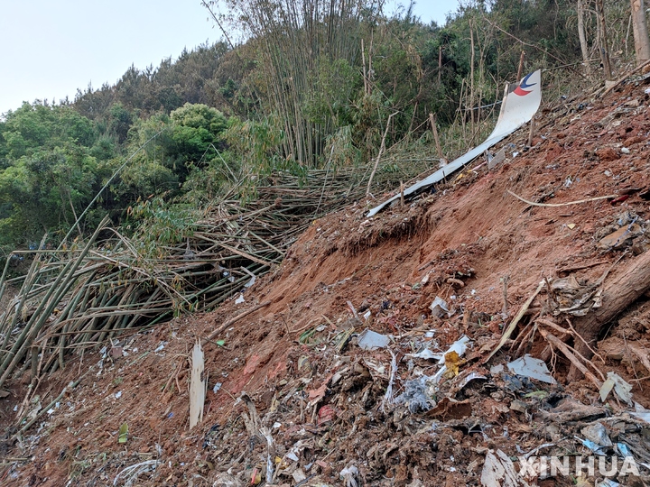 [텅현=신화/뉴시스] 21일(현지시간) 중국 광시좡족자치구 텅현에서 추락 여객기 잔해가 보인다. 승객 등 132명이 탑승한 중국 동방항공 소속 보잉 737 여객기가 텅현 인근 산악지대에 추락해 중국민항국은 비상대응체제를 가동하고 현장에 구조팀을 급파했다고 밝혔다. 2022.03.22.