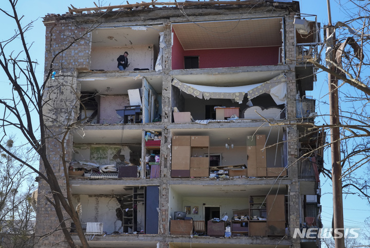 [키이우=AP/뉴시스] 21일(현지시간) 우크라이나 키이우에서 한 주민이 러시아군의 포격으로 폐허가 된 아파트를 살피고 있다. 2022.03.22.