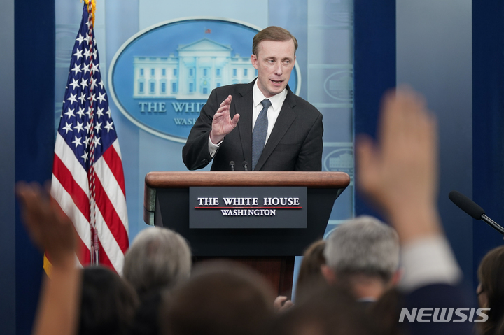 [워싱턴=AP/뉴시스] 제이크 설리번 백악관 국가안보보좌관이 22일(현지시간) 백악관에서 브리핑하고 있다. 설리번 보좌관은 러시아의 핵무기 사용 우려에 대해 '발생 가능한 비상사태'라고 평가하며 "상황을 예의주시하고 동맹국과 대응을 논의할 것"이라고 밝혔다. 2022.03.23.