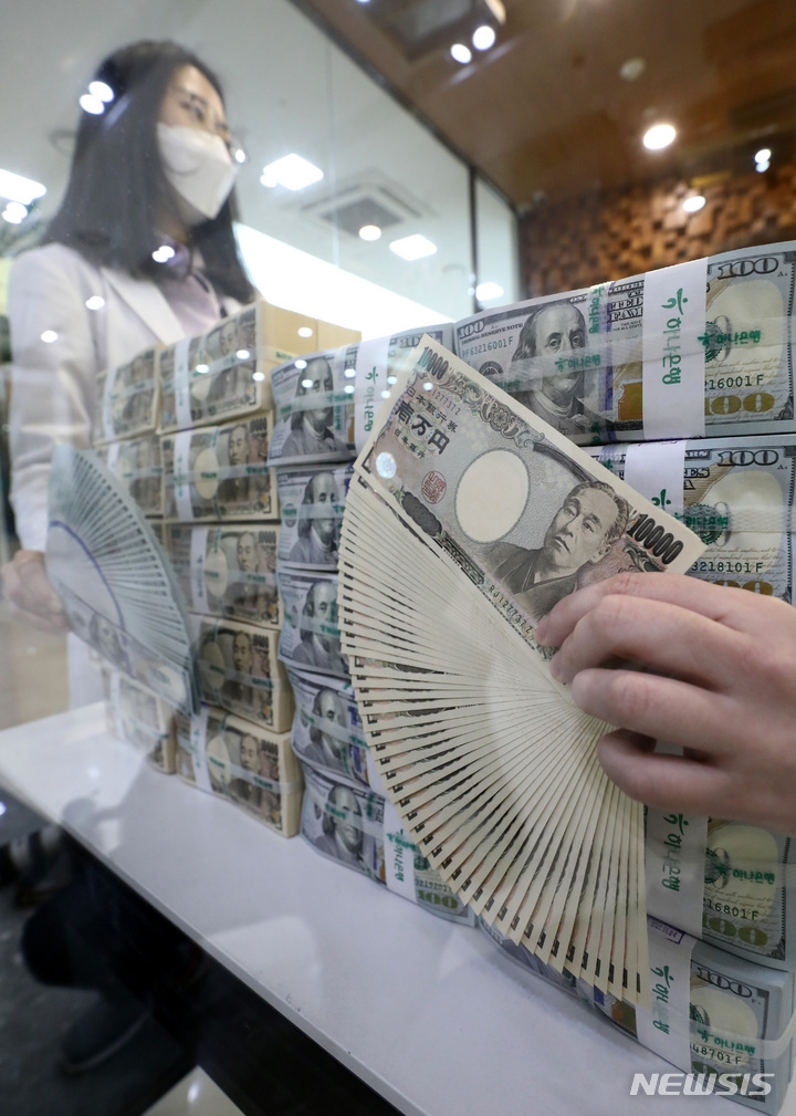 [서울=뉴시스] 이영환 기자 = 제롬 파월 미 연준 의장의 금리 인상 확대 시사에 엔·달러 환율이 1달러당 120엔대를 보인 23일 오전 서울 중구 하나은행 위변조대응센터에서 직원이 달러화와 엔화를 검수하고 있다. 1달러 당 120엔대로 엔화 가치가 떨어진 것은 2016년 2월 이후 6년 1개월만에 처음이다. 2022.03.23. [email protected]