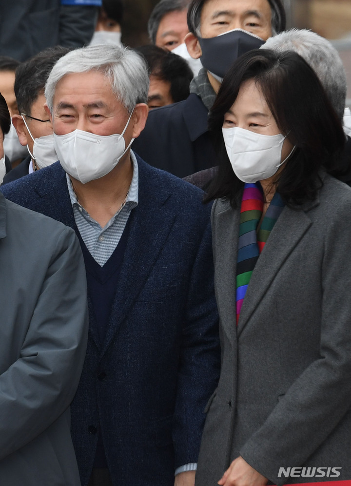 [서울=뉴시스] 조수정 기자 = 최경환 전 부총리겸 기획재정부 장관과 조윤선 전 문화체육관광부 장관이 24일 오전 서울 강남구 삼성서울병원에서 지난 연말 사면된 박근혜 전 대통령을 배웅하고 있다. 박 전 대통령은 지난해 12월 특별사면을 받아 석방된 후 삼성서울병원에서 입원치료를 받아왔다. 2022.03.24. [email protected]