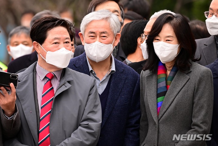 [서울=뉴시스] 조수정 기자 = 최경환 전 경제부총리, 조윤선 전 문화체육관광부 장관이 24일 서울 강남구 삼성서울병원에서 박근혜 전 대통령의 퇴원을 기다리고 있다. 2022.03.24. [email protected]