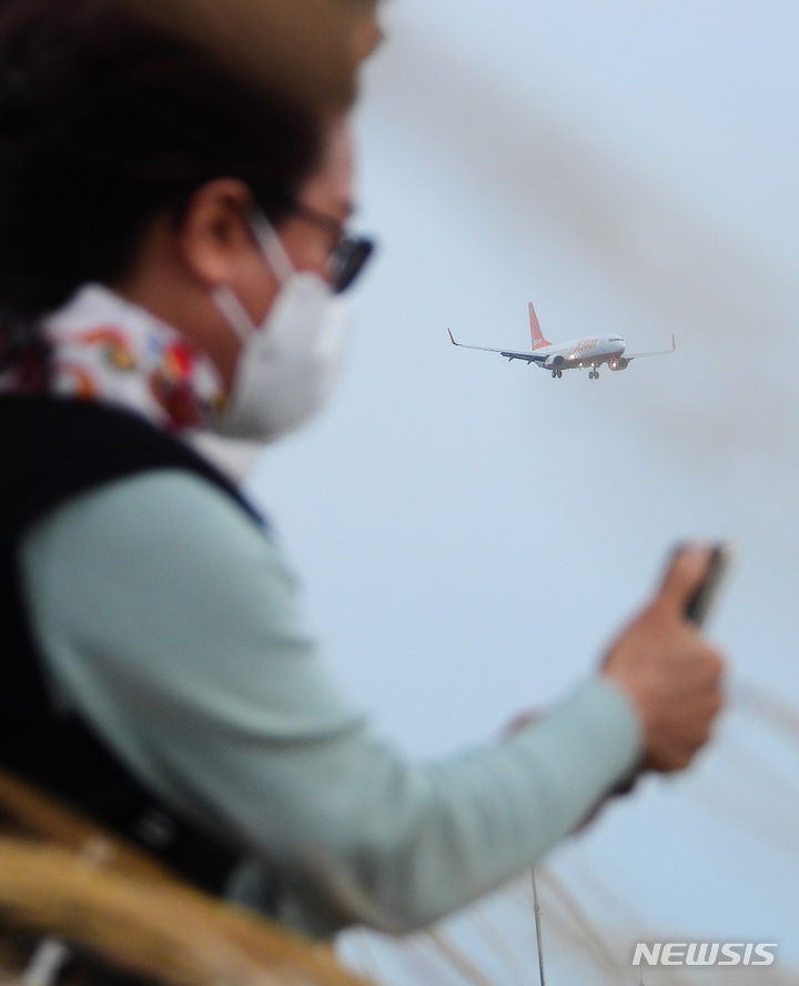 [제주=뉴시스] 우장호 기자 = 제주 지역에 초속 20m가 넘는 태풍급 바람이 불고 있는 25일 오후 제주국제공항에 항공기들이 강풍을 뚫으며 착륙을 시도하고 있다. 항공기상청은 이날 제주공항 이륙과 착륙 방향 모두에 급변풍·강풍 특보를 발효했다. 2022.03.25. [email protected]