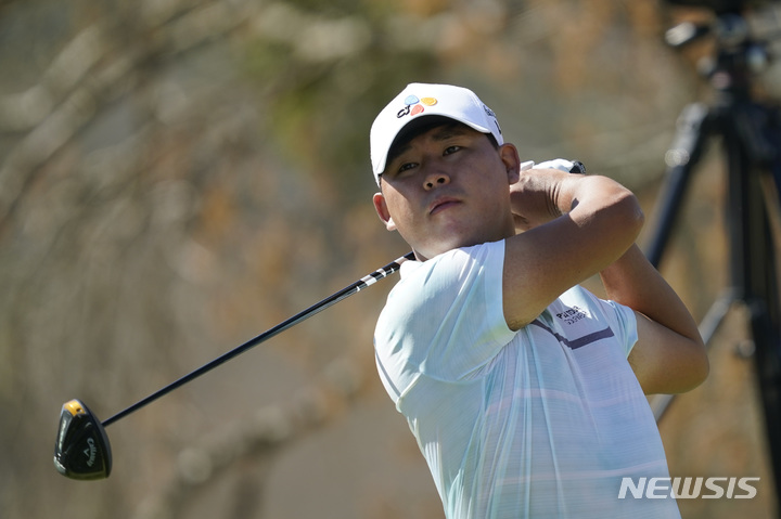 [오스틴=AP/뉴시스] 김시우가 25일(현지시간) 미 텍사스주 오스틴의 오스틴 컨트리클럽에서 열린 월드골프챔피언십(WGC) 델 테크놀로지 매치플레이 조별리그 3차전 6번 홀에서 티샷하고 있다. 김시우는 크리스티안 베자위덴하우트(남아공)에 6홀 차 대승을 거둬 2승1패를 기록했으나 승수에 밀려 16강에 오르지 못했다. 2022.03.26.