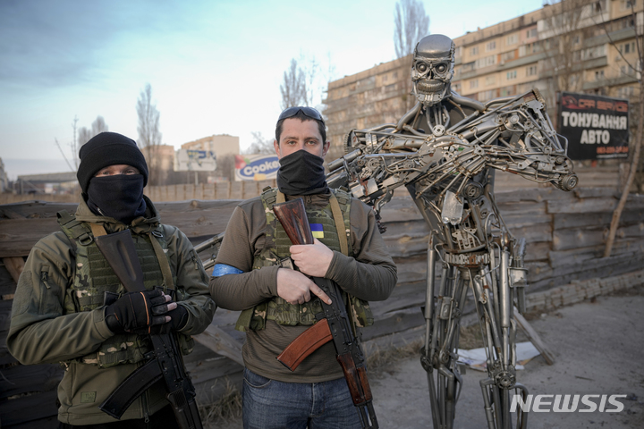 [키이우=AP/뉴시스] 우크라이나 방위군 지원병들이 25일(현지시간) 키이우의 한 검문소 인근에 세워진, 자동차 변속기 부품으로 만든 영화 캐릭터 '터미네이터' 옆에 서서 포즈를 취하고 있다. 2022.03.26.